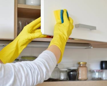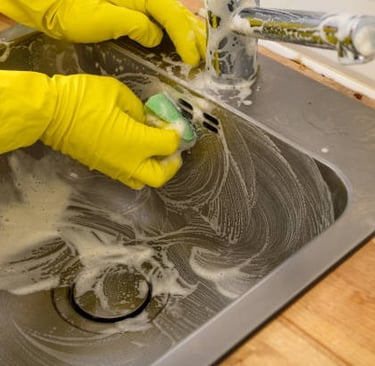 Cuisine : nettoyage de l’évier, du plan de travail, de la plaque de cuisson, des extérieurs d’appareils ménagers, vidage et nettoyage des poubelles.